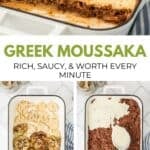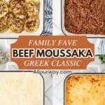 A collage featuring the first four steps to making the Mediterranean Moussaka recipe with eggplant and beef.
