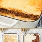 A four-photo collage showing the steps to putting together the Beef Moussaka in a casserole dish.